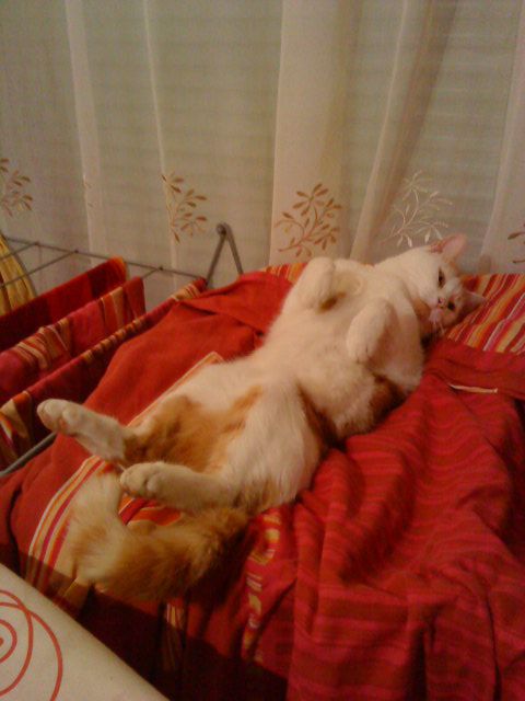 | Dire merci | Notre chat "binette" s'est mis à sécher tout seul !!! : démonstration : ![]() et petit à petit il glissait entre deux barre de l'étendoir (trop drôle !!!) |