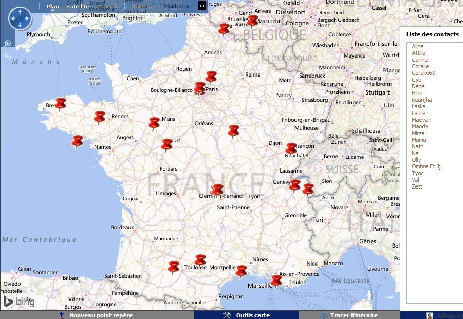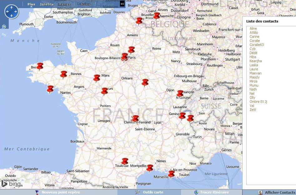 | Dire merci | Iris, Tyoc, razak, Lonestar : lisez page précédente pour les codes postaux ah oui j'avais mis ça plus haut et j'ai perdu Iris en route ! donc plus que Lonestar et Iris ( qui doivent être du même genre de coin neigeux !!! et je mettrais la dernière mouture ![]() Olly, j'ai téléchargé un petit truc sur Excel ! et après je fais une capture d'écran ! puis je bidouille les noms avec photofiltre mais les épinglettes, elles sont spéciales : c'est la tête qui montre l'endroit, pas la pique ! bon c'est mieux que rien et du jour ! |