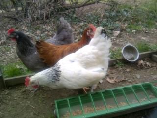 | Dire merci | Je vous présente mes nouvelles copines. Pour remplacer mes 2 tuées par le chien d'une copine fin décembre. Voici Salt, Pepper et Spicy ![]() ![]() (photo bof prise vite fait hier soir à leur arrivée avec un téléphone) Et ce matin, hop, 3 oeufs de plus !!!! Super, elles bossent déjà ! (mais ils sont encore petits...) |
