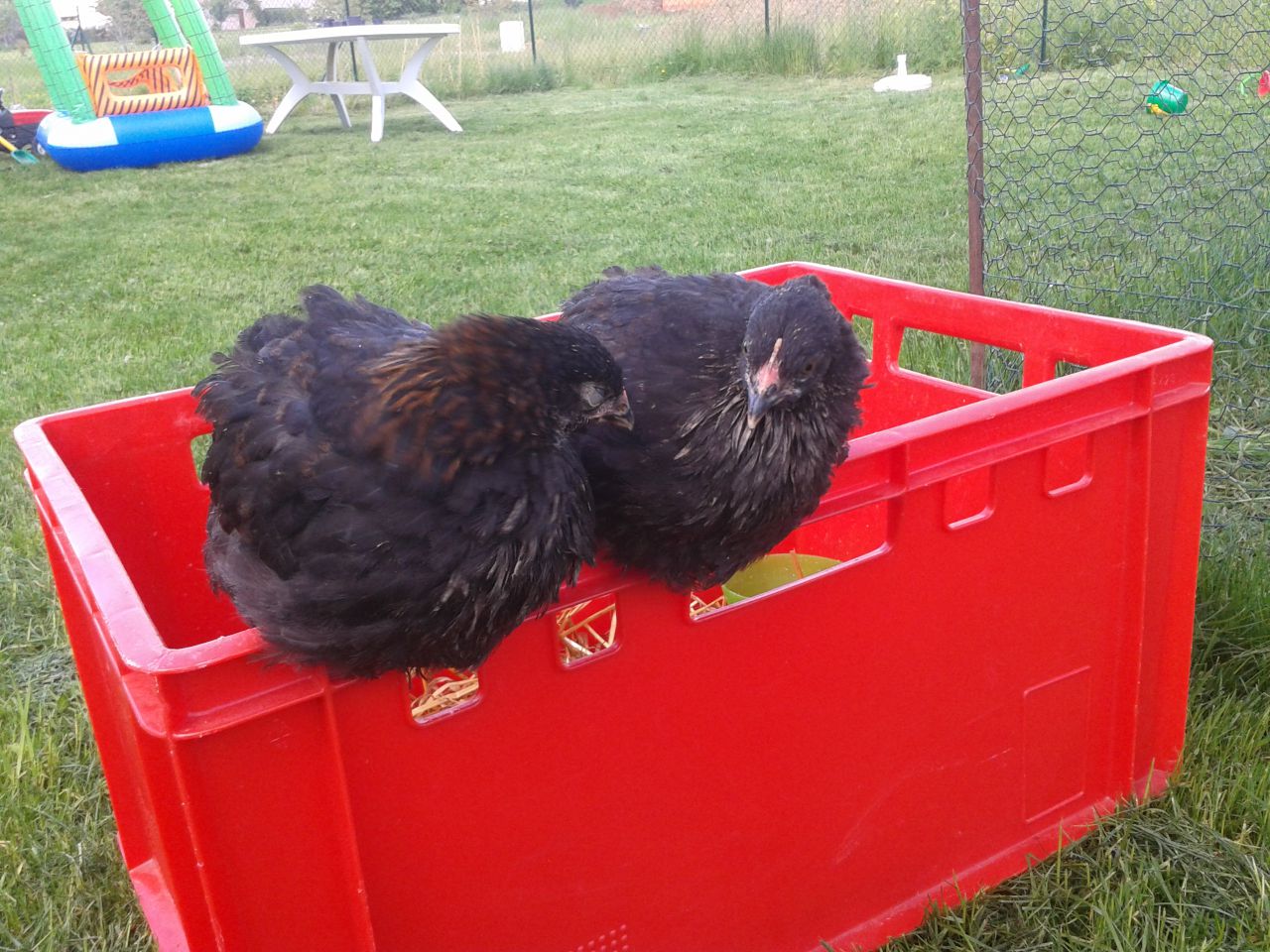 | Dire merci | Manue je n'ai qu'une seule adulte mdrr les autres c toujours des poussins mes negres soies elles sont pas bien vielle encore et très peureuse. Mais non je vais pas les mettre directement, j'ai plusieurs cases dans mon poulailler je comptais les fermes quelques jours avant d'ouvrir. A l'heure actuelle dans mon poulailler j'ai grosse cocotte (poule pondeuse rousse qui doit avoir 3 ans au moins) + mes 3 negres soies qui ont un peu plus de 3 mois maintenant. Et dans ma poussinière j'ai mes 5 poulettes pondeuse (3 noires et 2 rousses) + mes 2 canards qui sont devenus énormes mdrrr |