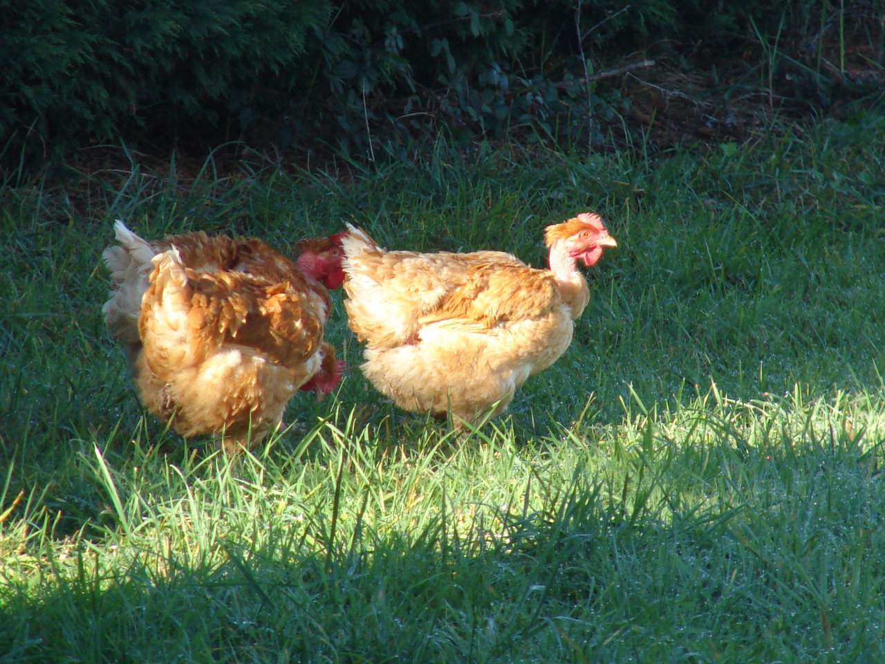 | Dire merci | Nos poules actuelles, on les a prises "poulettes prêtes à pondre". Ce sont des poules pondeuses "basiques". Une typée Sussex, 2 noires avec le camail rouge cuivré, et une rousse. Au début, elles étaient assez craintives, on ne pouvait pas les approcher. Mais maintenant, elles nous courent après dès qu'elles nous voient (des fois qu'on ait quelque chose à manger) et si on tend la main vers elles, elles s'aplatissent et se laissent caresser... En fait, tous les soirs, quand mon mari va fermer le poulailler, il les a habituées en les caressant (quand elles sont rentrées pour la nuit, elles sont à moitié endormies, et moins affolées, du coup elles ont pris l'habitude) ça s'apprivoise bien. |