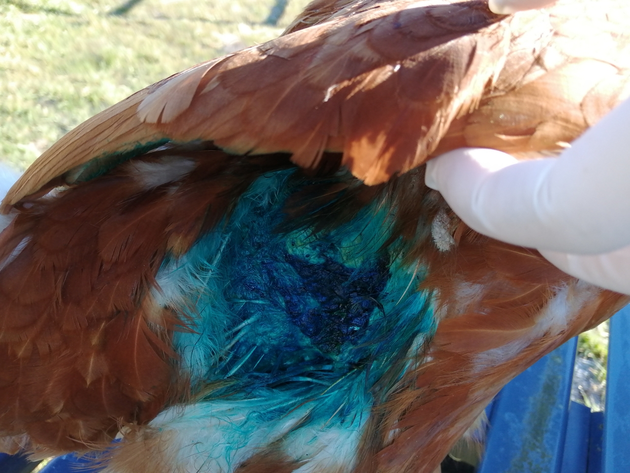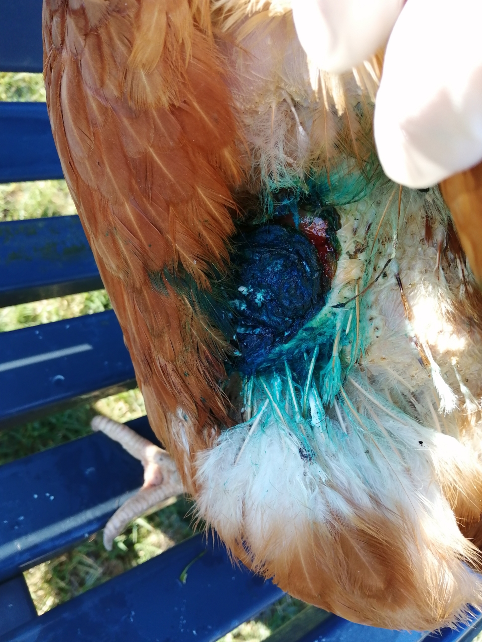 | Dire merci | Une des miennes avait eu le même souci j'ai soigné à la cicaseptive d'Equibao et miel (chaire à vif aussi, elle était fort esquintée) et elle s'en est bien remis j'avais laissé à l'air libre en l'enfermant dans un box. Par contre les plumes n'ont jamais repoussé. |