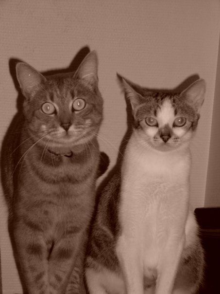 | Dire merci | 2 chats,l'une adoptée a la SPA en aout 2008 a 4 mois et le monstre,recuperé en juillet 2009,a 2 mois. la premiere supporte difficilement la solitude et qu'on lui change ses habitudes,le second,du moment qu'il a des calins de pôpa môman,il s'en fout... les 2 sont toujours fourrés ensemble,font leur toilettes mutuellement,jouent et font des degats dans l'appart...a coté de ça,la grande se plaint souvent du petit,mais elle fait ses coups discretement et s'etonne des resultats donc que du positif |