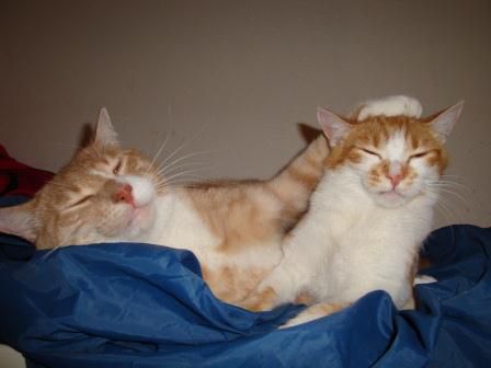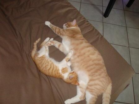 | Dire merci | J'ai deux chats (stérilisés) dans 75m2. Ils ont deux ans d'écart, il y a un gros et grand matou d'un peu plus de 7 kilos et une petite minette de deux kilos et demi toute mouillée. La cohabitation s'est fait très rapidement. Au début, ils dormaient énormément ensemble, à se faire des mamours, des léchouilles en ronronnant : ![]() ![]() ![]() (pour la dernière on remarque déjà l'air blasé de la minette )Mais Gros Matou est un chat aseez spécial, très dominant, que ce soit avec la chatte ou avec nous (j'avais jamais vu ça chez un chat). Et son truc c'est le jeu bagarre. Sauf que la chatte a fini par en avoir marre de tout le temps se faire mettre la pâté (forcément, vu la différence de gabarit ). Du coup, maintenant je ne les vois plus jamais en pleine séance de câlin. Ils font "chambre à part". L'entente est quand même "assez bonne", enfin pas de frittage intempestif, petite minette décide aussi de temps en temps de jouer et tend des embuscades pour faire peur au gros. Donc parfois, on voit le gros en train de se faire courser genre "au secouuuuuurs" par le microbe dans le salon. M'enfin il a quand même vite fait de reprendre l'avantage... |