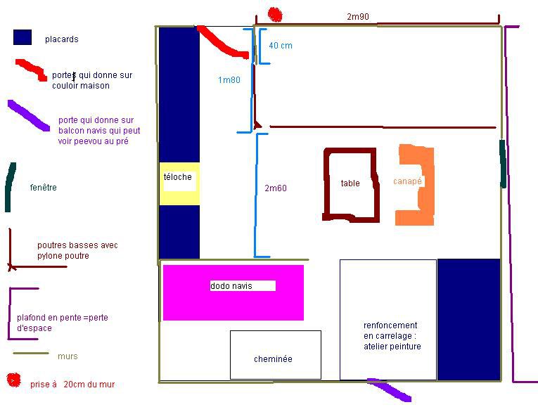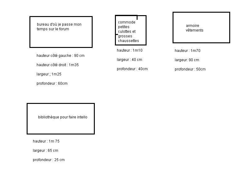 | Dire merci | Désolée c'était pr attirer du monde, bande de curieux J'ai besoin de vos idées de décorateurs nés ! et surtout besoin de vos précieuses neuronnes mathématiques ! Je suis en train de refaire ma chambre, et c'est pas très bien fichu dedans, du coups je n'arrive pas à disposer mes meubles correctement ! Bon ce n'est que visuel, car la peinture et le sol n'est pas finit. Mais disons que j'ai pr objectif d'acheter une sorte de "commode de beauté", je sais même pas cmt ça s'appelle mais bref un petit meuble à tiroirs pour que je puisse y déposer et y ranger mes produits de femmes, et y ajouter au dessus un miroir pr me faire beeeelle ! sauf que j'y arrive pas c'est con, mais jss dyscalculique et tant que je ne vois pas en vrai, je n'y arrive pas.du coups je vous ai représenté ma chambre en gros par dessins (magnifiques !! )le premier : ![]() les meubles que j'ai actuellement et que dc je voudrais déménager ds la nouvelle pièce ![]() et une idée que j'aurai pr agencer tout ça ![]() dc là ds les 80 cm de libre j'aimerai trouver une commode.beauté qui rentrerai mais bon sachant que le plafond est en pente, je doute pouvoir utiliser les 80 cm...et puis bah je sais pas où caser la biblio et en même tps jss pas tout à fait sûre d'optimiser au max mon espace là qu'en dites vous ? des idées de génies ? |