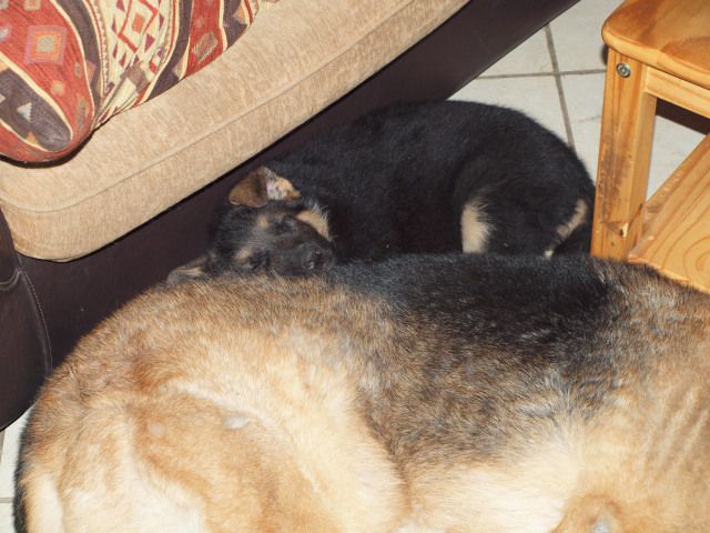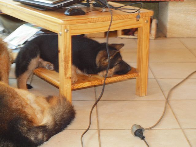 | Dire merci | Le 1 avril et ce n'était pas un poisson est arrivé à la maison un petit chiot Berger Allemand il a deux mois et ce nomme Golden : ![]() ![]() Rencontre avec Thyaz ![]() ![]() ![]() Paradoxalement c'est pas lme petit qui fuit devant le gros mais l'inverse par contre il y a deux jour un grand pas est franchis : ![]() |