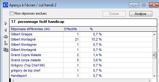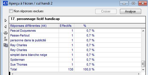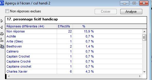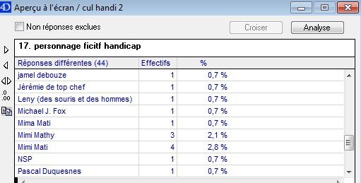 | Dire merci | Ça aurait marché, parce que "personage fictif handicap" c'est juste le nom qu'ils ont donné à la question pour se repérer dans le logiciel de traitement. La vraie question concernait aussi des personnages réels. D'ailleurs c'est vrai que quand on voit d'autres réponses, c'est même étonnant qu'il n'y soit pas Message édité le 25/04/11 à 11:05 |