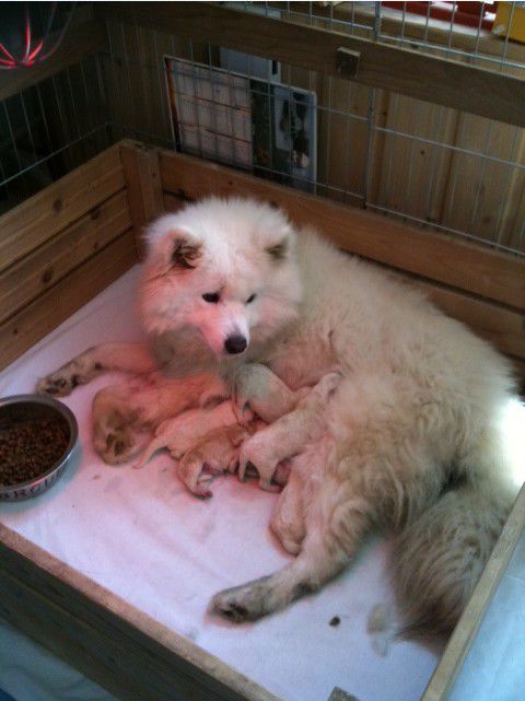 | Dire merci | Hier (et cette nuit), naissance de 8 petits bouts, 8 petits samoyèdes ! 5 mâles (dont un qui malheureusement ne va pas très bien) et 3 petites femelles. Donc 8 p'tits noms à trouver. (et on attend encore une portée pour dans 2 mois normalement) L'une des petites a déjà vécu de sacrées aventures : Après la naissance des deux premiers, plus rien pendant pas mal de temps, donc on s'inquiète, direction le véto... Auscultation, écho, on ne voit personne qui arrive. On va cherche la couverture dans la voiture pour que la mère reste en observation, on discute avec le véto... et en retournant à la voiture, on voit une petite chose par terre... Une petite, visiblement née dans la voiture, qui est tombé quand on a embarqué la couverture... Bref, la petiote va bien (pour le moment), on lui cherche un nom en rapport avec cette aventure. On a pensé à "Goodluck" Mais si vous avez des idées (ou pour les autres), je suis preneuse ! |