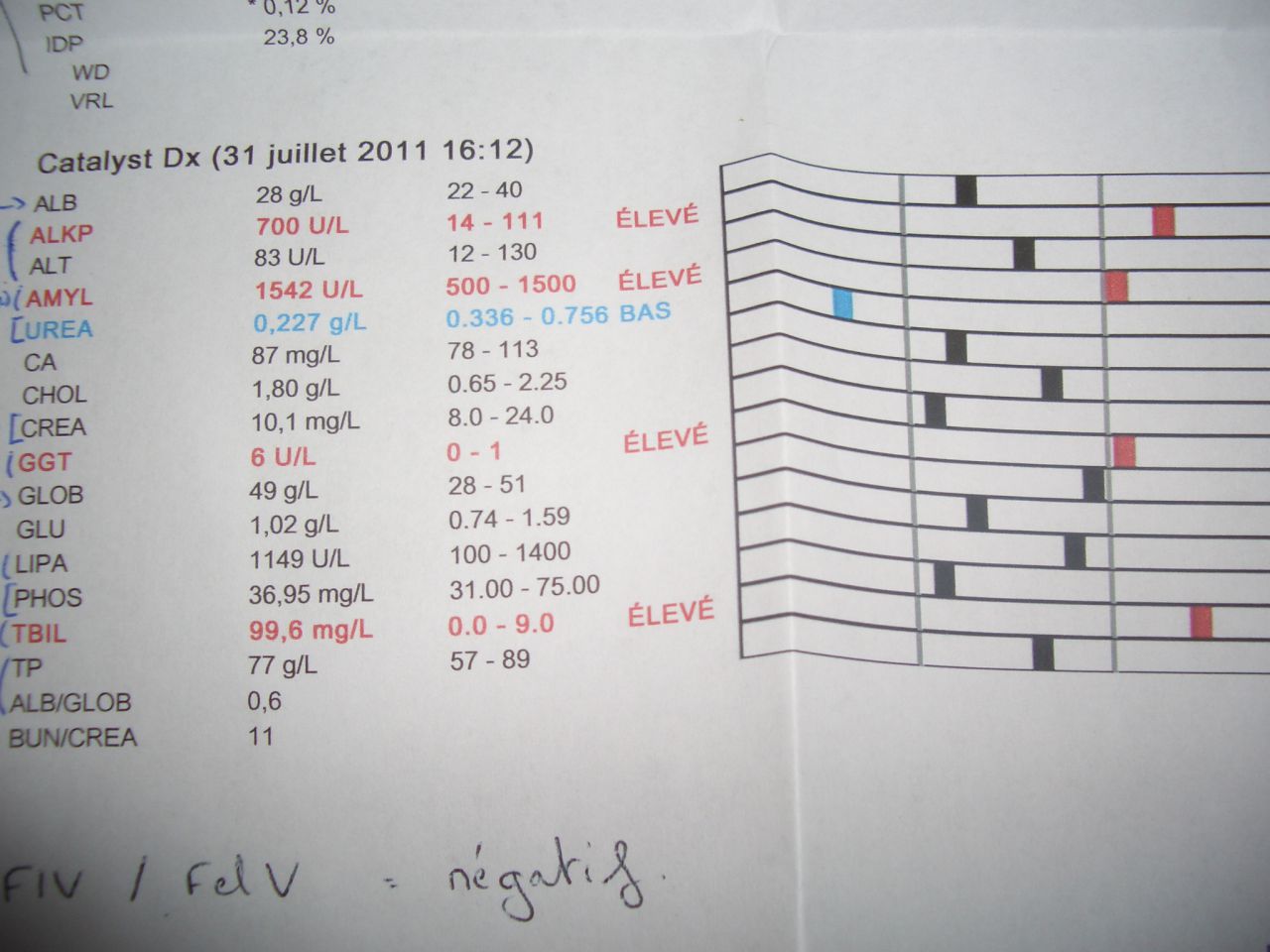 | Dire merci | continue sur cette voie ca passe pas en 2semaine cette maladie, mon chat a mis 1mois 1mois et demi pr s en remettre faut leur monter qu on est la et qu on se bat pr eux, j ai pas hesité a parler a mon chat comme si c etait un humain et delui dire de pas me laisser toute seule, et vu l amour qu on a l un pr l autre il a reussi a combattre sa maladie, et je pense que d aller le voir 2fois par jour 30min mini ca le rassurait bon courage soit patiente, si je retrouve les resultat de sa prise de sang je te les donnerais, mais t en fais pas au debut qd je l ai mené pr un controle, elle me l a gardé direct en urgence aussi et m a dit qu il avait 50% de chance de s en sortir.....dc ne baisses pas les bras |