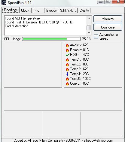 | Dire merci | Bonjour ! J'ai un PC portable HP depuis 3 ans. Il a toujours un peu bugué mais ça va mieux depuis que j'ai fait beaucoup de tri dans les dossiers. Par contre, il fait un bruit d'ENFER, je le met sur mes genoux, ça me brûle (vraiment, ça brûle) les cuisses, il est en surchauffe permanent .... Je viens de télécharger le logiciel "speedfan" qui permet de voir le degré de chauffe (très français ce que je dis ^^) de l'ordinateur. Je vous met la capture d'écran, sachant que là j'ai seulement la page internet 1cheval.com d'ouverte ![]() J'y comprend rien c'est en anglais mais rien qu'à voir les petites flammes à côté des noms, je crois qu'il y a un probléme ... |