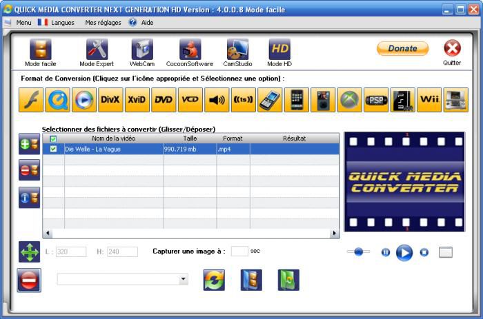 | Dire merci | donc normal si VLC et windows les lisent pas je ne connais pas le logiciel qui le lit. Souvent dans ce cas, faut retrouver le Cd fournit avec l'apn et tu as un logiciel qui permettra de les lire mais pas forcément de les epxloiter pour un site Je te propose cette solution. Télécharge quickmediaconverter (gratuit) ça ressemble à ça à la fin de l'installation ![]() Va sur le Plus vert de gauche, tu choisis la video que tu veux convertir à partir de ton pc ou de ton apn Au dessus tu as les icones permettant de choisir le format de convesion, sur le F tu as le .avi pour vlc, le plus simple à exploiter. Tu choisis donc conversion en .avi Ensuite en bas dans les 3 icones tu cliques sur le dossier du milieu, tu choisis le dossier de destination du fichier converti, le bureau par exemple. Et tu lances la conversion en cliquant sur les deux flèches qui tournent. Quelques minutes tu aruas ton fichier en .avi et tu pourras le lire avec VLC qui est le format le + complet. Tu peux convertir comme ça en plains de format jusqu'à trouver celui qui te convient. Message édité le 20/08/11 à 11:12 Message édité le 20/08/11 à 11:19 |