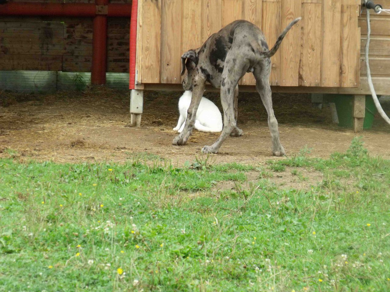 | Dire merci | J'ai pas de soucis, je pose juste des questions car j'aime beaucoup voir la complicité qu'il y a entre ces deux là ! J'ai toujours eu de chiens, toujours en "petite meute" mais c'était toujours une autre race (dobermann) et c'est vrai que le dogue allemand est bébé plus longtemps que le dob qui, je trouve, est stable assez tôt (pour ceux que j'ai eu). Pour la stérilisation de ma chienne, j'y pense de plus en plus, mais la dernière anesthésie (attaque d'un chien étranger) a été assez dure pour elle. Chez moi, au grand damne de mon mari, tout le monde se fait castrer chien chat chevaux !!!! mais elle est plus fragile donc j'hésite un peu plus à sauter le pas !Je pense en parler à mon véto dès son retour de vacance pour voir un peu ce qu'il en pense. En attendant, je me régale de voir tout ce petit monde (chat compris) partir à la chasse au souris au milieu des balles de foin en se sautant sur le dos et se roulant par terre .... |