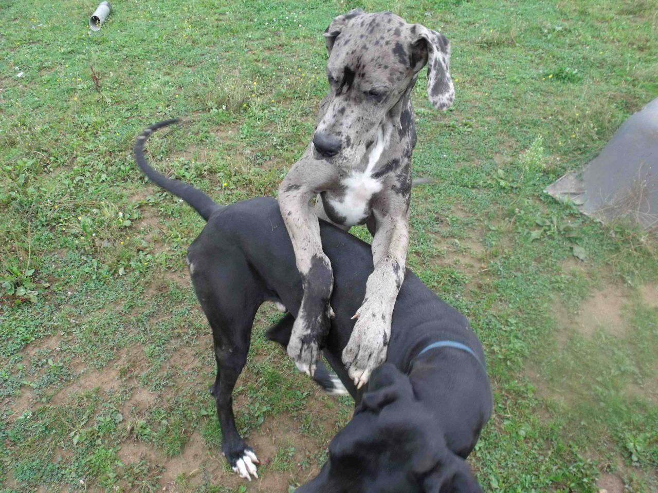 | Dire merci | Voilà ma troupe : Le chat et mon plus jeune dogue avec une tentative de gobage de tête ! ![]() Les deux dogues : ![]() En train de jouer : ![]() ![]() Là, il s'est coincé en voulant jouer à saute mouton ( ou saute dogue allemand !) ![]() Et ma petite chienne avec le chat pour vous donner un ordre d'idée, ils font le même poids 2kg !!!! ![]() Et voilà !!!! |