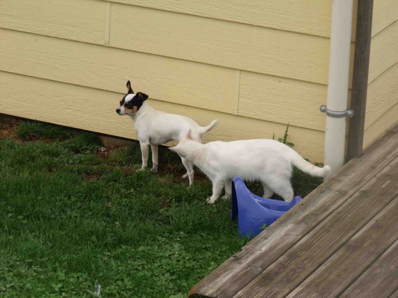 | Dire merci | Faut que je vous trouve une photo les 4 au complet. Je n'ai jamais réussi à prendre la promenade du chat car le temps que je dégaine l'appareil, ils sont passés à autres choses. Au début je le grondais car j'avais peur qu'il lui fasse mal, mais au final comme le chat dit rien (il est vraiment bonne patte celui là) je les laisse faire! Mon doguinou fait également çà avec mes poules, mas elles aiment beaucoup moi !!! |