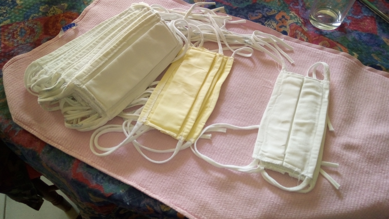 | Dire merci | plush C'est ce que j'ai fait, oui (regarde sur youtube, trapilho, il y a des tutos pour faire ça avec un vieux tee-shirt) Je n'ai pas fait le système élastique derrière les oreilles, je n'aime pas ça, et de plus, je trouve que cela ne permet pas d'ajuster correctement le masque. Je préfère nettement les liens à nouer, un en haut derrière la tête, l'autre derrière la nuque. Là, au moins, le masque s'ajuste bien. Avec des élastiques, on ne peut rien régler... (au bloc, on ne porte pas les masques à élastiques, ceux là c'est pour les soins rapides, ou pour les visiteurs...) Regarde la photo que j'ai mise plus haut, on voit les liens. |