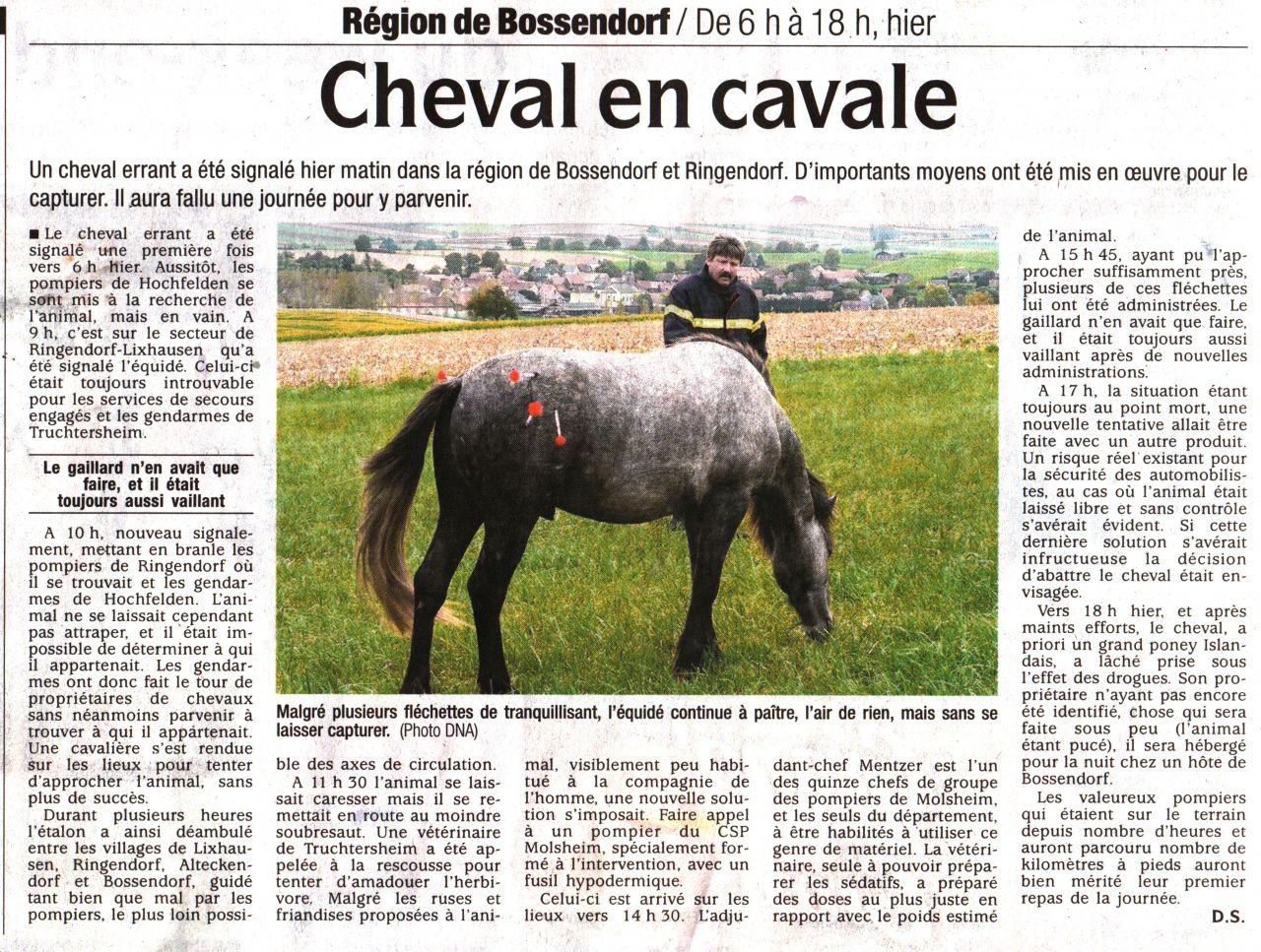 | Dire merci | Ma collègue véto a acheté un poney, puis s'est séparée de son compagnon, etc... le poney est resté en pâture avec 3 ponettes à moitié sauvages tout l'hiver, elle a voulu le récupérer au printemps, niet !! Tout essayé, passé des journées entières dans la pature, friandises, sas, nada... Elle a fini par utiliser son fusil hypodermique, bah avec 4 fléchettes dans le cul, comme le poney dans le reportage, il s'est jamais endormi. Al, tu as une idée de protocole anesthésique pour ce genre de cas ? (étant en clinique mixte, elle a utilisé du Rompun voire ce que ça donnait, mais que dale, est-ce qu'un coup d'Imalgène irait mieux ? Domosedan ? ) Sinon, pour tous ces animaux tués, c'est sûr, c'est un immense gâchis vu la valeur qu'ils ont de tout point de vue. Même si je comprend bien comment les autorités en sont venues à cette solution radicale, je ne peux m'empêcher de penser qu'il y avait peut être d'autres solutions... |