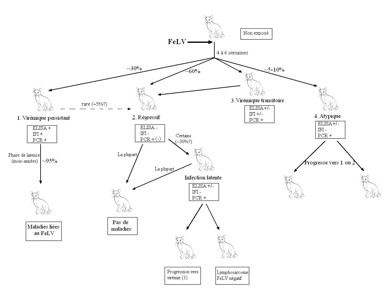 | Dire merci | il est possible pour un chat de se débarrasser du FeLV (ne pas employer le terme "leucose" qui est impropre ), quelques semaines après la primo-infection, dans 30% des cas.c'est pourquoi, si l'on détecte un chat FeLV+, il faut toujours refaire un teste 8 semaines plus tard. Et ne pas faire confiance à un test positif sur un chat sain (pour le FeLV, dans 50% des cas, chez un chat sain, un positif est un FAUX positif.) Le confirmer par PCR. Par contre, un chat diagnostiqué (avec certitude) FIV+ ne s'en débarrasse jamais ![]() |