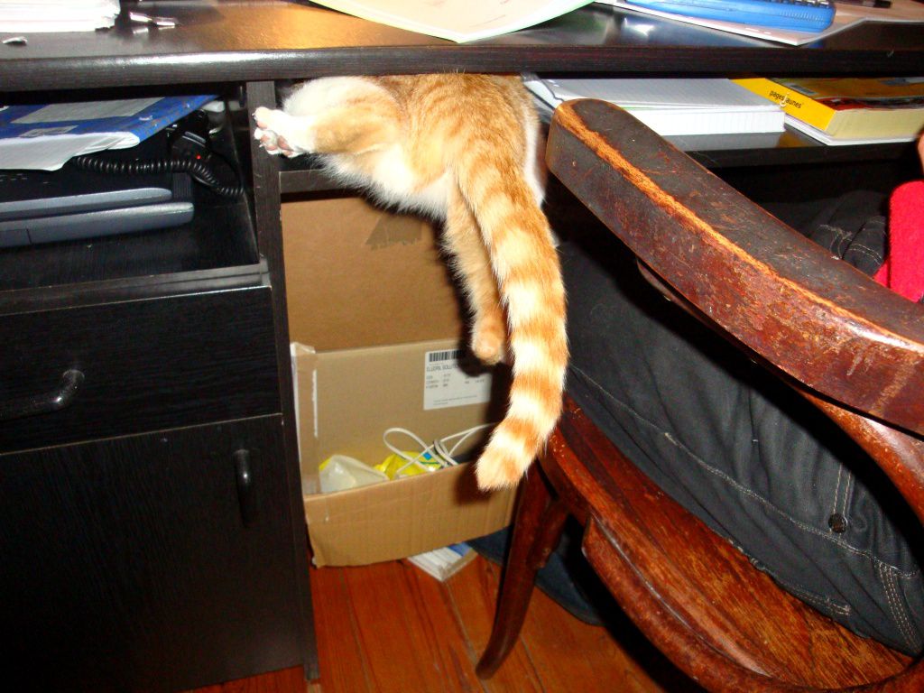 | Dire merci | Mouhaha la vidéo est juste énorme On voit qu'elle ne comprend absolument pas pourquoi ça marche pas, mais que les neurones s'entrechoquent pour trouver une solution, sans résultat. Sinon, j'ai aussi du chat con. Minette, coincée la tête dans le bureau. Elle avait voulu s'engouffrer là dedans, en poussant avec les postérieurs sur la chaise. Sauf qu'elle a trop poussé, que les postérieurs ne touchaient plus rien, et qu'elle pouvait que pédaler dans la vide. Bha y'a fallut la tirer de là (après quand même avoir pris le temps d'hurler de rire et de prendre une photo )![]() |