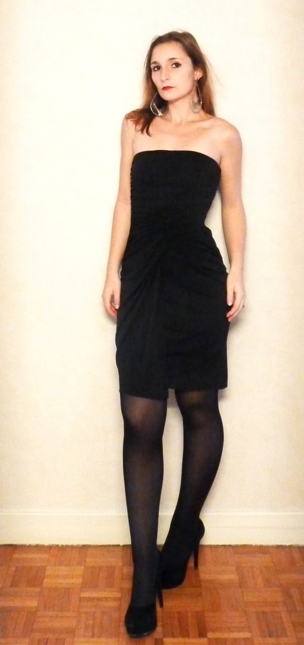 | Dire merci | Tant que j'étais aux essayages Cap's j'ai testé la bustier Mango noir drapée que je t'avais suggéré ! J'te vois commencer à hésiter sur les fameuses classiques noires elle donne ça : (avec 10 centimètres de talons plateaux) (J'ai l'impression de faire 1m80 là-dessus ) |