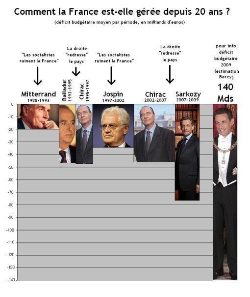 DéconnectéDire merci | Ben, le graphique est la courbe des déficits publics depuis 1960. Avant de tirer des conclusions sur la responsabilité de tel ou tel gouvernement, il convient de porendre en compte l'inertie ou le temps qu'une décision politique met pour avoir un résultat. |