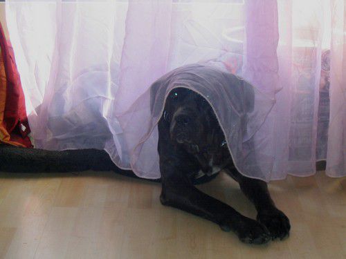 | Dire merci | oui oui ! tit chien, pour bien me montrer qu'il veut sortir "là tout de suite maintenant immédiatement" court dans toute la maison pour ramener LE truc qui fera que je suis obligée de me lever pour aller le lui enlever de la gueule ... genre une chaussure qui a eu le malheur de trainer, un pantalon( plus grand que le chien), un pull .. enfin tout ce qu'il peut attrapper et se planter devant la porte, en remuant de la queue et avec le truc dans la gueule ... pas le choix ... faut que j'aile llui ouvrir !!! |