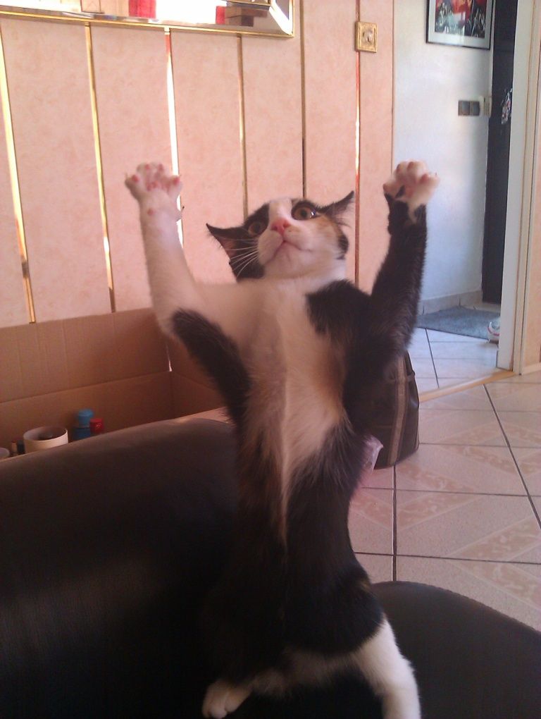| Dire merci | J'adooore!! Elle fait plein de poses de "tu cherches? Tu cherches la merde???" Mon chat fait rarement cette pose en crabe mais ça me fait toujours autant rire |