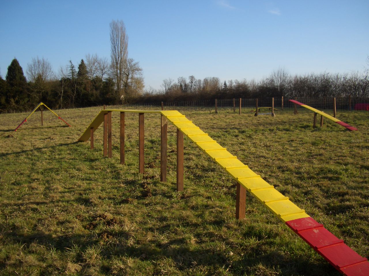 | Dire merci | alors, je vous explique, je suis educatrice a mon compte, et je veux offrir a mes clients le meilleur (comme beaucoup d'ailleur)...... je vous décrit un peu le topo.... alors, c'est sur un terrain en herbe tondu toute les semaines a 4 cm...... j'ai un ring de travil de 15m*10m, un ring couvert de 11m*9m, un ring éveil du chiot de 7m*10m et un terrain d'agility de 40m*25m...... tous les enclos sont sécurisés par du grillage pour eviter toutes fugues possibles..... sur le grand ring et le couvert, il sont nus au sol, mais selon les exercices, je met de quoi faire un slaloom, des petit obstacles ou autres....... le ring chiot, il y a une mini passerelle de 25cm de haut, une bache au sol, des fils avec clochettes et un petit tunel...... pour le terrain d'agility, les obstacles ne sont pas omologués ( le prix le justifie), mais solide et aux normes...... il y a 3 obstacles a sautés réglables en hauteur, une passerelle, une palissade, une balançoire, un pneu, un slaloom et je vais ajouter une table et un grand tunel............... pour le confort des clients, il va y avoir un grand parking en gros cailloux, des band avec de l'ombre une poubelle, un cendrier et c'est déja pas mal je pense......... dites moi ce que vous en pensez et n'hésitez pas a me donner des idées ![]() je vous mets quelques photos ![]() ![]() sur celle là, on appercoit le ring chiot derriére ![]() ![]() lachez vous ![]() |