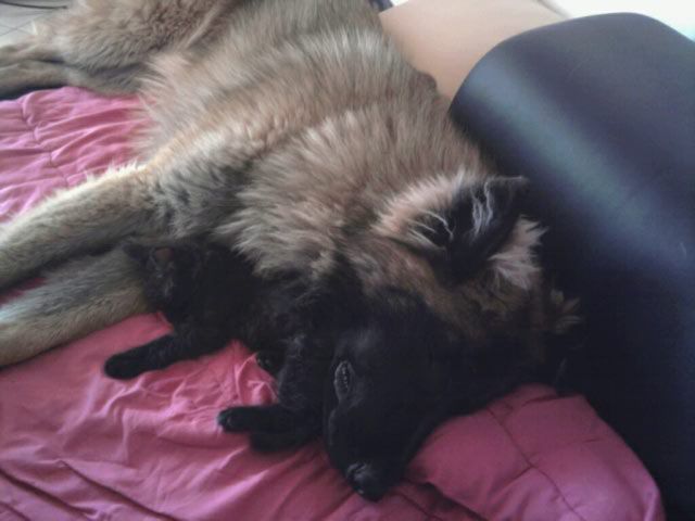 | Dire merci | Fuego en mode "j'suis crade et alors !" ![]() Fuego qui surveille son nouveau petit frère à son arrivée (Guizmo le chat) : ![]() Petit calinou : ![]() |