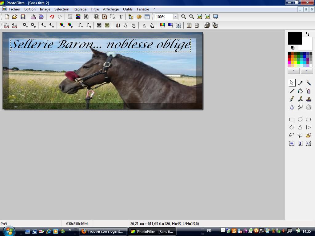 Déconnecté | je travail sur la nouvelle bannière de ma société mes fournisseurs m'ont conseillé une belle photo de ma jument retravaillée qui mette en application mes valeurs : nature-produits naturels-petits prix mais bon j'aimerai bien coller un slogan sur ma bannière mais quoi ![]() z'avez des idées? le nom de la sellerie c'est Sellerie Baron Pour le moment je suis à '' Sellerie Baron ..." LOL c'est un bon début j'ai pas d'idées ![]() |