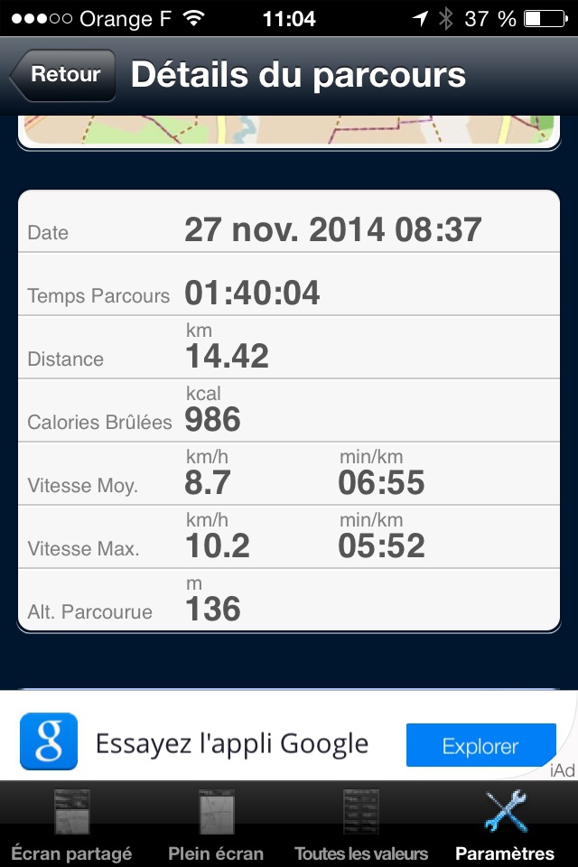 | Dire merci | majaffi j'ai testé le géonaute Le problème c'est que les capteurs doivent être humides, donc je les ai mouillés avant de partir mais au bout de 10mn il a commencé à merder, il affichait des valeurs improbables puis ne captait plus. Il s'est remis en route correctement quand j'ai transpiré Donc j'ai fait 20 mn tranquille + 2*2mn d'accélération pour m'échauffer. Puis le dernier km en accélérant progressivement pour faire monter le cardio le plus possible, à priori ma FCmax est de 190 bpm. Si je ne veux pas dépasser 75% de cette valeur il faudrait que je ne dépasse pas les 140-150bpm (suivant la méthode de calcul), je vais tester ça en fin de semaine sur la boucle de 17km pr voir à quel rythme ça correspond. |