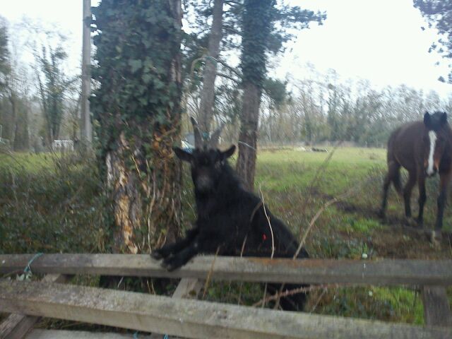 | Dire merci | Coucou tout le monde!!! Je vous présente Kiki, petit bouc nain de 2 ans que nous avons ramené à la maison il y a 2 jours. Nous l'avons pris pour débrousailler notre pré...et il est super attachant!!! Pour l'instant, je l'ai mis en box avec de l'eau et du foin et je le sort une bonne heure dans la journée avec une chaine de 10mètres et seulement en ma présence. Il pleut en ce moment et je ne peux pas aménager correctement son enclos. il y a déjà du grillage mais il est à réinstaller. Que me conseilleriez vous pour éviter toute évasion? une clotûre de 1.20m ou 1.50m? Deux poules et une copine vont surement le rejoindre...et je ne tient pas non plus à ce que les poules passent par dessus...je vais également lui ramener une pierre à sel et le vermifuger en même temps que mes chevaux...Auriez vous quelques conseils à me faire parvenir car ils sont les bienvenues!!! Sinon mes jujus l'on adoptées tout de suite, très intriguées au départ puis ...Mon chient veut jouer au ballon avec lui mais kiki préfère les coups de tête à la zizous... |
