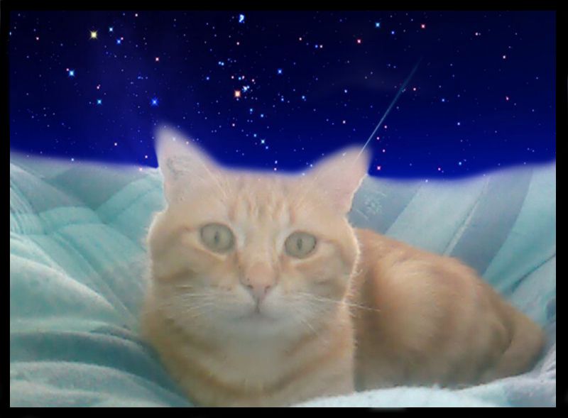 DéconnectéDire merci | merci choubidouwah c'est super gentil oui je vais le faire incinérer ! j'irai le chercher à la clinique et je l'emmenerai moi même au funérarium (en plus, il n'aimait pas la voiture alors ça le rassurera surement d'etre près de moi avec toujours les mêmes musiques ) je garderai précieusement ses cendres et le jour où j'aurai cette maison, je disperserai ses cendres! comme ça il aura lui aussi le droit au jardin coté couleur de mon Garfield, c'est exactement ça ! est-ce que quelqu'un pourrait reprendre cette couleur de Garfield (qu'a fait choubidouwah) et le mettre avec l'arrière plan correspondant au ciel étoilé ? (et retirer le cadre noir) Je pense que ça sera parfait comme ça ! (par contre, je préfère ne rien écrire sur la photo ) |