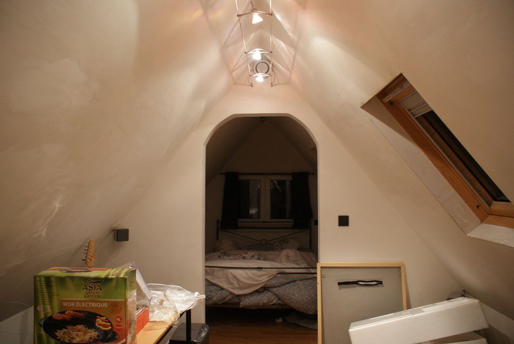 | Dire merci | Il faut que je mette une couche de primaire avant car c'est tjrs du plâtre Photo à l'entrée de la partie "dodo" (pas regarder le bourdel!) partie dodo voilà ![]() |