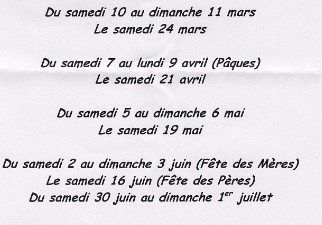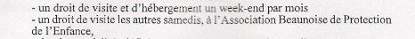 Déconnecté | Je viens de recevoir un mail de l'ABPE, apparemment le juge a du leur mettre les points sur les "i" : "Nous souhaitions être certains des attendus du Juge des Enfants avant de mettre en place le calendrier de visite à tous les samedis. Nous avons reçu ce jour la réponse du juge, donc je vous renvoie aujourd’hui un calendrier où toutes les visites seront notifiées." |