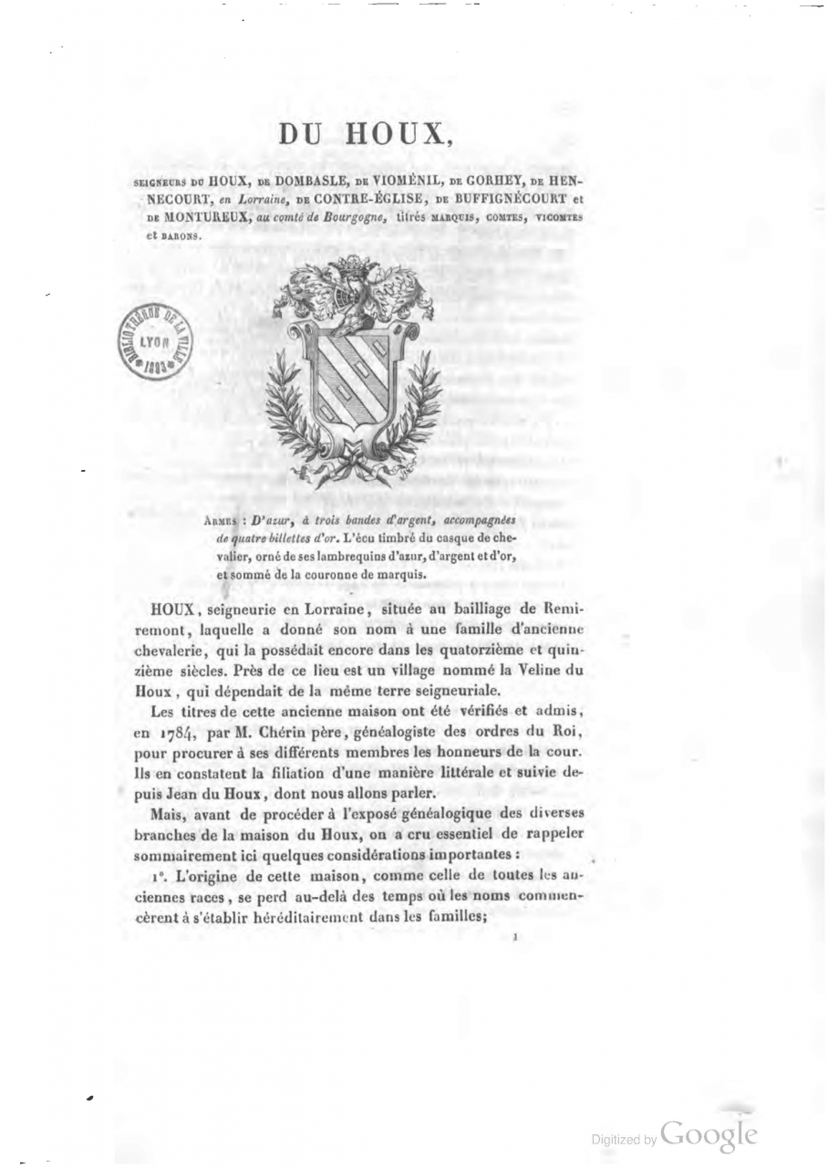 | Dire merci | d'où vient le supplément "de Gesnes" Sans doute une précision géographique, bien qu'ils soient tous localisés au départ à Monthureux s/Saône ? tu as aussi des Pia ou des Grosjean Non, il n'y a que des noms à rallonge Mais nos aïeux ont forcément du se croiser (au bas mot ) Les Vioménil et les Hennezel sont tout près, j'ai vu que tout était dans un rayon de 20 km !! ![]() Il est fait mention d'Attigny dans certaines parties de l'arbre : "naissance: HOUX (DU),Seigneurie en Lorraine, Bailliage de Remiremont, qui a donné son nom à une Famille d'ancienne Chevalerie, qui la possédoit encore dans les XIVe &XVe siècles. Près de ce lieu est un autre village, nommé Laveline-du-Houx, qui dépendoit de la même terre. Cette ancienne Noblesse,dont les titres ont été vérifiés par M. Chérin, Généalogiste des Ordres du Roi, remonte, par filiation suivie, à[...]" "Cette généalogie est le résultat des déductions faites avec un Professeur spécialiste de l'histoire lorraine et d'autres généalogistes. En effet François du HOUX, Ecuyer Seigneur du Haut Bois et gentilhomme verrier transmet à son fils Humbert la charge de verrier. A son tour ce dernier la transmet à son fils Nicolas né vers 1600. Reste Florentin né vers 1595 dont on ignore la profession. Le 7.04.1631: Réversales aux gens de comptes à cause d'ascencement fait par les comptes de Lorraine à Claude du HOUX, Adam De MASSEY, Jean De FINANCE, Nicolas et Humbert du HOUX frères, tous écuyers, d'un canton de bois sis en forêt d'Attigny,pour le convertir en terres labourables. Source: ADM&M B642 N°72." |