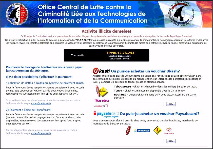 DéconnectéDire merci | En cours d'utilisation j'ai eu une page qui est arrivée pleine écran avec en haut à gauche un logo et le nom de la SACEM et à droit écrit POLICE NATIONALE Un texte disant que j'avais téléchargé des fichiers illégalement et bla bla loi Atopi que je devais payer 50e en allant chercher je sais plus quoi dans un bureau de tabac et entrer un code pour payer et débloquer mon ordi C'est quoi encore cette histoire ? Du coup je squatte l'ordi de ma fille mon ordi est réellement bloqué... Une idée c'est quoi ce message un virus ? Merci |