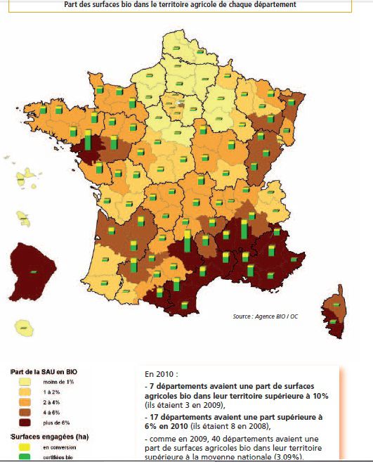 | Dire merci | Et juste une dernière chose, voici la carte du Bio en France, selon les surfaces agri engagées dans le cahier des charges par région : ![]() Pour montrer que OUI, les mentalités changent, petit à petit, certes. Mais elles changent!! |
