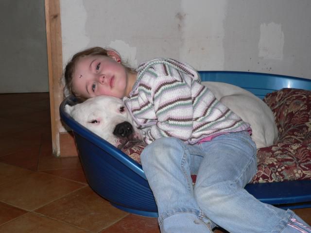 | Dire merci | ah autre chose pour la bouvier, elle déteste l'eau aussi ! Par contre elle obéit super bien sans qu'on est eu à la dresser plus que ça, cherche pas à se sauver, tu peux laisser la propriété ouverte elle restera là . Elle est assez grognon par contre , elle grogne pour un oui ou pour un non ... perso ça me soûle ! Le Dogue Argentin !! AAAhhhh le DOGO ... bon ben déjà pour moi c'est LE chien de famille/ garde PARFAIT ! J'ai eu plusieurs race de gros chiens avec mes parents : beauceron; dobermann et AUCUN n'a trouvé à me satisfaire complètement ... alors que le dogo , franchement c'est LE chien pour moi idéal ! Et je dis pas ça non plus parce que j'en ai un mais parce que j'en suis plus que satisfaite ! C'est un chien dissuasif de par son gabarit et parce qu'il en impose simplement, c'est pour moi un SUPER gardien efficace : pas gueularde pour un sous, elle n'aboie d'ailleurs quasiment jamais sauf si elle veut se faire remarquer pour jouer en m'appelant et en faisant des vocalises de ouf TRES calme dedans mais réactif dehors pas un brun de nervosité juste se qu'il faut , obéissant, sympa (certain peuvent être dominant à l'égard de leurs congénères mais bien éduqué ça pose pas plus de soucis que ça ) la mienne et sa maman était pareille accueille les gens en leur faisant la fête SI et seulement SI je suis là ! ou mon mari quoi . En revanche SI on est pas là (déjà testé en se cachant pour l'observer) elle ne laissera pas rentrer et ne se laissera même pas toucher !!! Sauf par la famille ou amies qu'elle connait et qu'on accepte . De même qu'elle nous protège mais un truc de fou ! Quelqu'un qu'elle ne sent pas (et qui nous semble aussi étrange et dont on va se méfier ) elle ne le laissera pas rentrer et nous fait comprendre par son insistance et son attitude défensive fort appuyée qu'il ne doit pas rentrer !! C'est rare qu'elle fasse ça mais c'est déjà arrivée! Idem quelqu'un qu"elle a dans le nez c'est fini elle ne l'acceptera plus (sauf si je suis là) , genre mon oncle qui la provoquait un jour en la taquinant exagérément elle lui à juste chiquée les doigts , depuis il ne peut plus la blairer et elle ... NON PLUS et bien si je suis là ça va, sinon c'est même pas la peine qu'il essaie de la toucher elle à commençait à nous protéger à ses 8 mois, ça nous à mis sur les fesses son attitude ! on se promenait en fôret avec mon mari , quand un type louche est sorti d'une allée c'est posté au milieu du chemin et c'est mis à nous guetté étrangement ... la chienne c'est alors mis entre moi et mon chéri , dans le sens inverse de nous en marchant à reculons pour surveiller le mec ![]() On à halluciné ce jour là, juste 8mois, et elle nous protéger déjà ! Elle adore l'eau, ça mère aimait moins ça mais aller dedans quand même pour nous faire plaisir ! Avec les enfants (comme n'importe quel gros chien sous surveillance uniquement ! ça reste un chien ) JAMAIS aucun mauvais comportement, jamais un grognement RIEN ! Les 2 ont été élevés avec des enfants en bas âge en prime . Avec les autres chiens : Val tess était dominante mais PAS agressive ! Jamais elle n'a attaquée , elle ne voulait pas être ennuyée , et le faisais savoir en grognant . Avec sa mère ça passait mal car je pense qu'elle à été jalouse à son arrivée pensant que celle ci allait lui piquait sa place . on ne les laissait pas ensemble sans surveillance, hors elle se côtoyaient et vivaient ensemble au quotidien quand on était là et lors de nos absences ou là nuit elle avait chacune leur enclos et niche . Te Quiero la maman était une soumise et ADORABLE même un rat elle ne l'aurait pas mangé !! (on lui en avait déjà mis un sur la tête ) là ou Val tess l'aurait croqué ![]() Nan franchement ce sont des chiens extra !! Alors pour ce qui est de l'endurance ... les miennes l'étaient pour faire des petits footing avec nous mais pour suivre à cheval ZERO ! Trop lourde elles s'essouflaient vite ... et traînaient derrière plus qu'autre chose du coup je ne les emmenais pas mais en même temps c'est pas toujours pratique d'emmener son chien en balade. Après tu as des dogos plus ou moins trapu/osseux, moi je te conseille un entre 2 . Comme Val tess c'est bien, Te Quiero commençait déjà à être fort carré limite on la prenais pour un mâle Bon enfin c'était une chienne magnifique représentante parfaite de sa race qui à été multi primée Voilà ce que je peux te dire du dogo ! Et je pourrai aussi te conseiller des élevages au besoin ![]() |