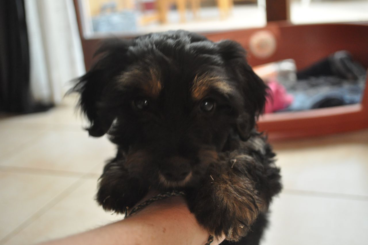 | Dire merci | Et bien voilà, depuis une semaine, le petit Hugo est puccé, vacciné, vermifugé, il est à nous ! Il a déjà bien grandi, c'est un nerveux, il cours tout seul dans le jardin en grognant Niveau propreté, on le félicite avec une friandise dès qu'il a fait dehors, et les accidents ne sont plus qu'occasionnels ! Il va se poster devant la porte fenêtre, et pile si on attend trop, il commence à bien comprendre ! |