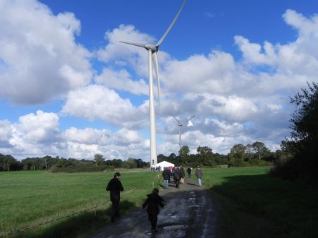 | Dire merci | Me voilà de retour de l'inauguration. 4 Enercon E82, de "petites" machines par rapport à d'autres: seulement 78 mètres de mât et 2 Mégawatts de puissance. Conditions météo idéales: pas de pluie, nombreuses éclaircies et... un vent de 70 km/h au niveau des pâquerettes. Là haut, ça brassait fort On a commencé à les entendre (au dessus du bruit du vent dans les arbres) à quelques 400 ou 500 mètres. Et on est resté juste en dessous durant toute l'inauguration sans que ça ne gène qui que ce soit ![]() Photos à suivre... |