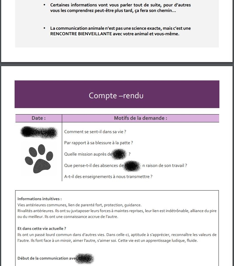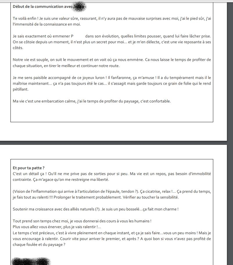 | Dire merci1 | Sauf qu'on ne parle pas de communication directe là dejavu . personne ne remet en cause la capacité de communiquer des animaux, entre eux, et avec nous... sauf que cette communication est directe. Moi, je remet surtout en question la capacité de rentrer en communication et de dire des choses sur un animal juste au travers d'une photo... pour moi, ça relève du même délire que ceux qui pensent pouvoir communiquer avec les morts. Que des personnes soient plus sensibles que d'autres et puissent percevoir plus de choses que le commun des mortels, je veux bien le croire, mais l'interprétation et la monétisation de ce "don" me posent problème... après, s'il y en a qui sont prêt à croire et à payer pour ça, c'est un peu leur problème, pas le nôtre, c'est juste dommage quand c'est au détriment de la santé de l'animal. |