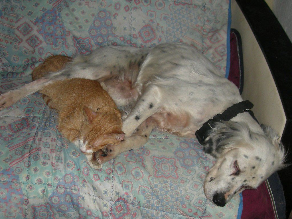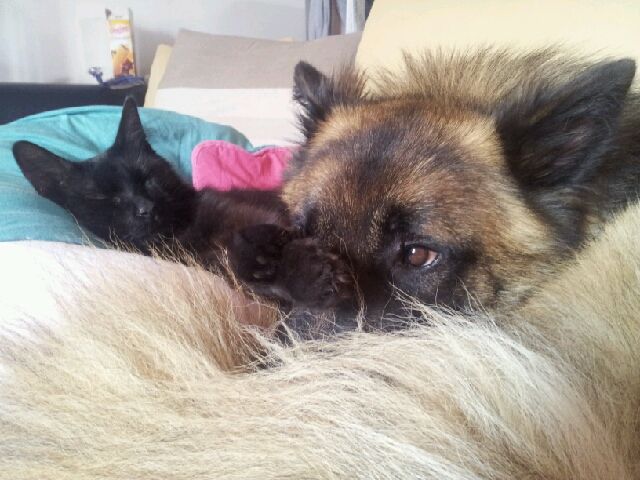 Ma chienne, 37 kg, et notre chat, sauvé et récupéré à un ou deux jours... Qui sont devenus de grands copains, ma chienne pourtant eexclusive m'a vraiment ému pour le coup!