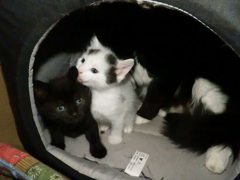 Bein euuuh, le tigré (ha ha, mais ils le sont tous! ), pas le dernier en tout cas, le jeunot au dessus, couché de son long dans le panier avec la tête de ton toutou posée à côté!