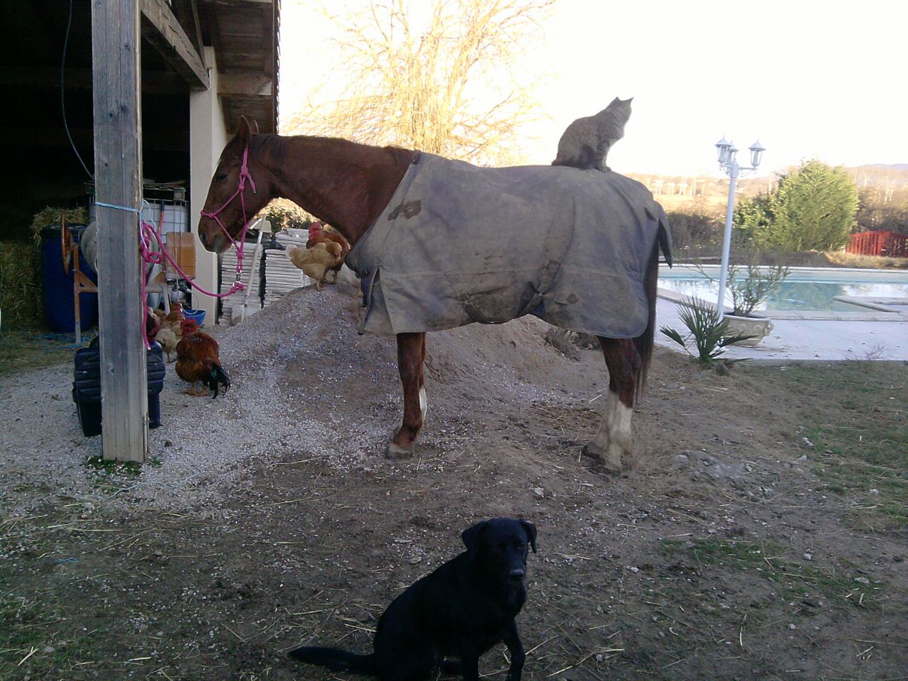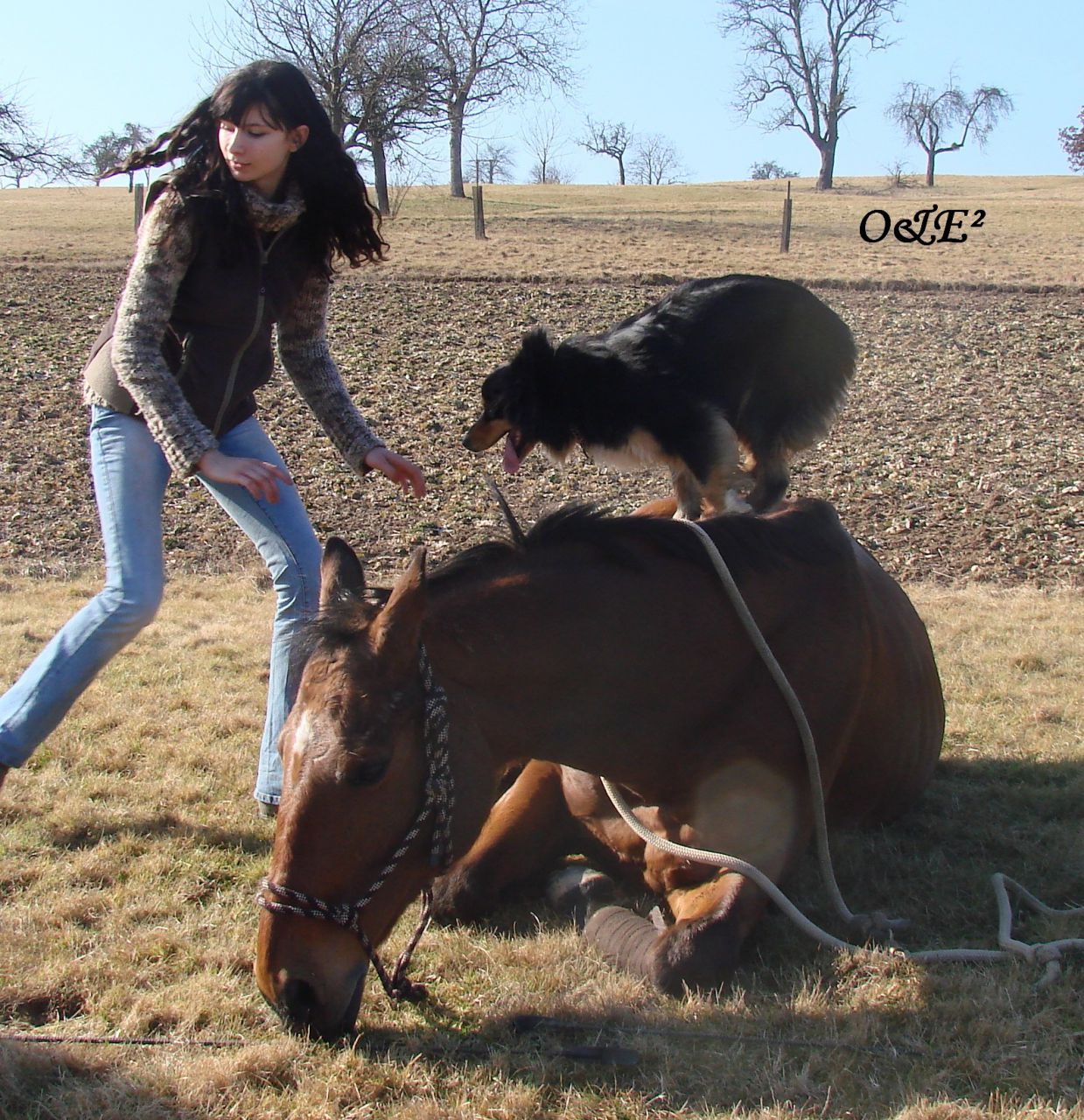 | Dire merci | Eydia, vingt kilos, et Océan et Kenny, 400 kilos chacun. Quand ils s'ennuient, ils se font des courses poursuite dans la pâture : a l'aller, la chienne court après les chevaux, et au retour c'est l'inverse Quand je bosse les gros, elle est toujours avec nous, a courir derrière ou autour ![]() ![]() |