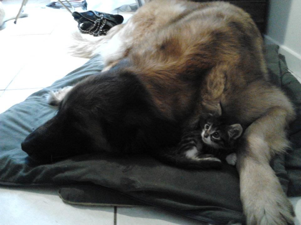 | Dire merci | Des photos du petit chaton que j'ai recupéré à 1 jour, là où il est placé ... ![]() ![]() et avec Nana la leonberg .. ![]() |