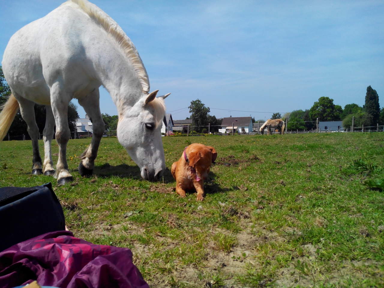 Déconnecté | Il y a quelques mois, je l'avais lâché une fois sur le chemin de balade habituel (un chemin en herbe entre 2 immenses pâtures de plusieurs dizaines d'hectares). Il était sage... Ouais bah les 10 premières minutes niquel, il écoutait bien, s'arrêtait et s'asseyait à ma demande, revenait vers moi quand je l'appelais... Et puis BIM en une fraction de seconde il s'est sauvé sous les fils barbelés et je l'ai vu disparaitre dans les herbes hautes. De temps en temps je voyais sa tête dépasser car il sautait (c'était rigolo au début). Puis au bout de 15min à l'appeler, plus rien. Il était 18h, en plein mois de décembre, le brouillard tombait, la nuit aussi. Bin je me suis faufilée sous les barbelés (j'ai bien arraché mon manteau ), j'ai galéré à traverser la pâture (vide heureusement mais herbes hautes et trempées, avec ma chienne en laisse dans une main). Il a fini par revenir au bout de 10min que j'étais dedans, en pleurs, le coeur battant, me voyant déjà prévenir tout le monde.Et il est revenu tout fier de lui, dégueu jusqu'aux oreilles, essoufflé d'avoir couru comme jamais. Ah ça il en avait besoin... Depuis je lui ai acheté une médaille avec mon nom, prénom et numéro de téléphone, il a deux laisses, une enrouleur de 8m pour le mauvais temps et la deuxième ce sont deux longes à chevaux de 8m que j'ai assemblées. Il peut courir un peu mais certes pas autant que s'il était libre. Il en a besoin en plus. Ça me fait mal au coeur qu'il ne se dépense pas comme il devrait. Mais quand je l'emmène dans des terrain clos (les 1300m² de mes beaux parents par exemple ou un des paddocks de 3000m² de mon âne, bin il ne court pas grrrr). |