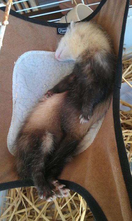 | Dire merci | Bon la petite Saya est bien arrivée !! Alors en effet, même ma plus grande cage est trop petite... Je voyais vraiment la furette plus petite que ça !!! Du coup, demain on part en normandie pour l'emmener directement chez mon copain car là la petite va être malheureuse sinon. Donc on a pris des croquettes spécial furet, les mêmes que donnaient déjà la dame. Et on lui a acheté un hamac, elle dort ![]() |