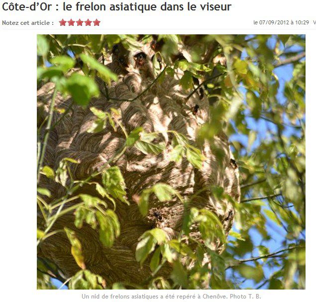 Déconnecté | je viens de voir dans le BP qu'un nid a été détruit et pas bien loin de l'école, ça rassure un peu ( la rue est à vol d'oiseau à 500 mètres ) : " Le nid de frelons asiatiques qui avait été repéré rue Maxime-Guillot à Chenôve (voir nos éditions du 7 septembre) par des riverains a été détruit hier soir. Vers 20 heures, profitant du temps pluvieux (les frelons asiatiques se regroupent dans leur nid lorsqu’apparaît l’humidité) les membres du GDSA (Groupement de défense sanitaire apicole) de la Côte-d’Or ont utilisé une perche pour enfumer les frelons à base d’un composé soufré. Plusieurs centaines d’hyménoptères sont tombés au sol, sur une bâche préalablement installée par les apiculteurs. Les pompiers sont ensuite entrés en action, avec la grande échelle, pour décrocher le nid. Plusieurs riverains assistaient à la scène, soulagés de voir disparaître les frelons. Selon Philippe Gaulard et Patrick Chiclet, apiculteurs et membres du GDSA, le nid abritait environ 10 000 frelons. L’insecte, très agressif, “importé” d’Asie, est un prédateur très efficace, qui se poste en vol stationnaire devant les ruches, et tue les abeilles en vol. Un second nid aurait été repéré dans le secteur des carrières Bacquin." ![]() Lien |