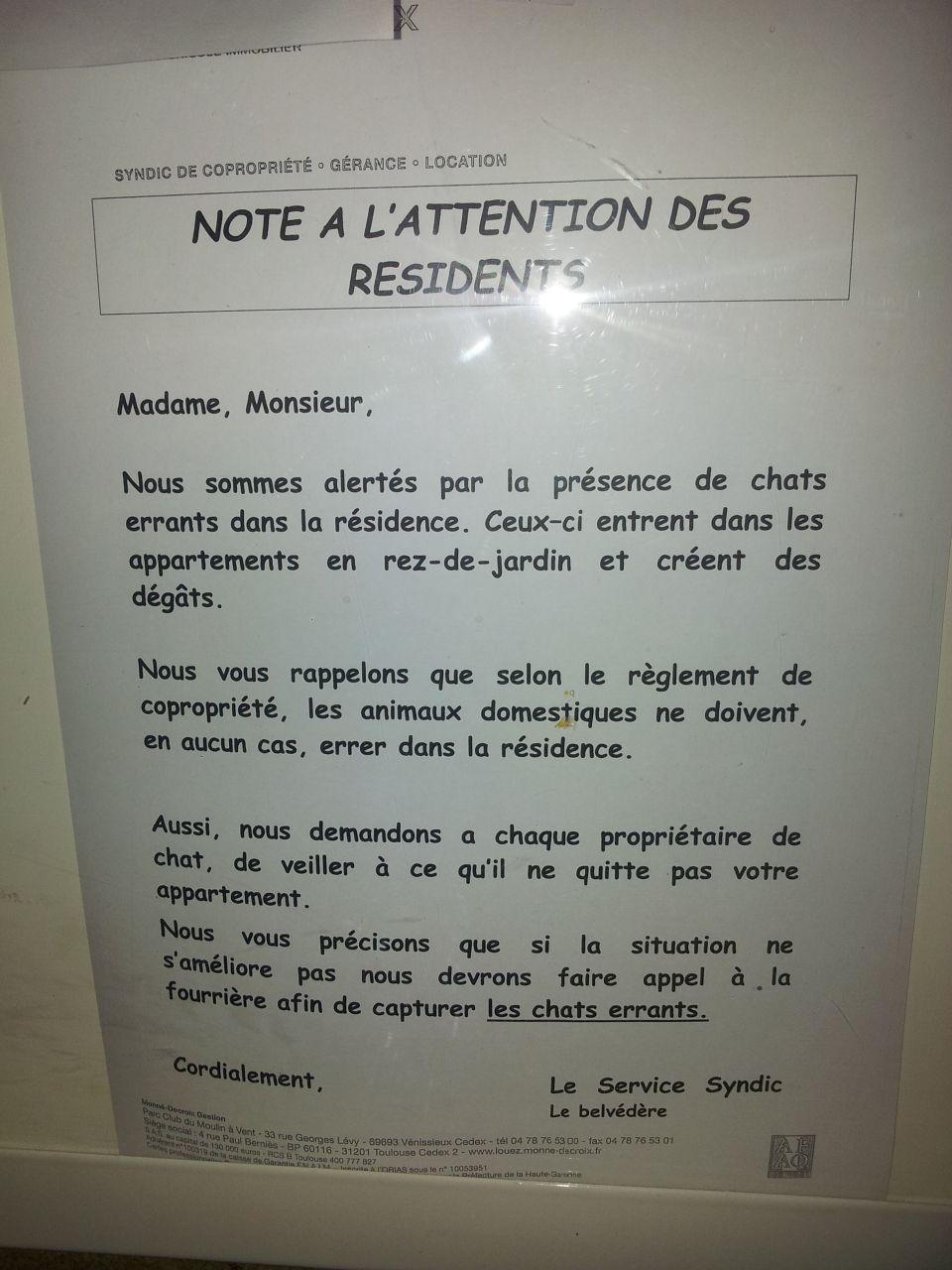 DéconnectéDire merci | Pour situer le contexte, j'habite dans une résidence privée (bâtiments + grand parc clos au tour). J'ai un chat, qui a collier et médaille avec n° de téléphone. Que je laisse sortir, il reste le plus souvent dans l'enceinte de la résidence. Voilà ce que je viens de trouver afficher dans l'allée : ![]() La question est : est-ce qu'ils peuvent interdire de faire sortir les chats dans la résidence ? Que peuvent-ils faire, est-ce que la fourrière pourrait intervenir, et prendre mon chat (qui a collier et médaille), DANS la résidence ? Si quelqu'un a des références de textes de loi à me donner ![]() Ca m'embêterait vraiment de devoir enfermer mon chat, il a l'habitude de sortir, et en étant en RDC ce serait ingérable |