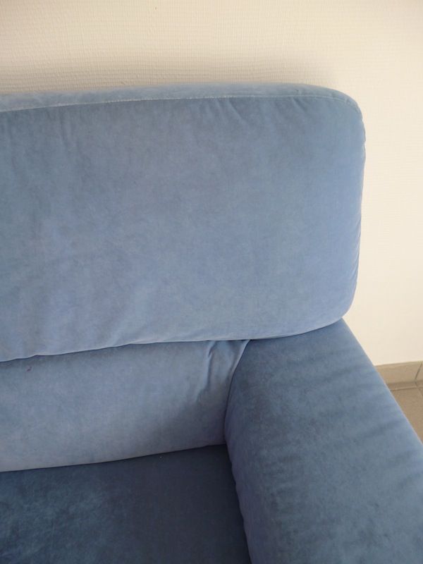 | Dire merci | Reste à voir comment ça va vieilir, mais de toute façon, je n'en pouvais plus de ce bleu ciel, alors je ne regrette rien. Maintenant j'ai un gris ciel breton Et je vous rassure, on n'a pas le derrière gris quand on se relève du canapé, une fois sec, ça ne bouge plus du tout. |